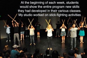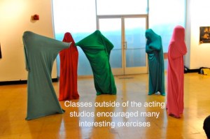 Being a theatre student, my classes consisted of Physical Comedy, Contact Improvisation, Movement, Tai-Chi, Voice, Stage Combat, and a daily Acting class, as well as optional electives such as Musical Theatre, Acting For Camera, Clown, Mask, and Shakespeare. In addition to these regular classes there were one-time classes, ranging from a Master Musical Theatre class taught by Jason Alexander (best known as “George” from Seinfeld), a class in the African dance of capoeira, and class on “the business” where a casting director came and talked to us about the casting process of plays and movies. Many of my regular classes focused primarily on breathing and relaxation exercises, highlighting the importance of being physically strong and connecting the body to the mind. I learned many relaxation techniques and muscle workouts that I have developed into a daily routine to get myself prepared for the day.