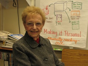 Louise acknowledges that the economic downturn has been partially responsible for a diminishing number of classroom volunteers. Some parents have returned to the workforce and some have been forced into longer commute cycles. At a time when education funding is at its lowest point in years, the need for volunteers may be at its highest. Though she now gets around with a rolling walker (her knees act up every so often), she faithfully makes the 1.5 mile drive to Frederiksen. “I could probably walk the distance but then I’d be too tired to help out.” she joked. She continues her in-classroom support on Fridays and then assists in the office on Tuesday mornings. She helps the staff with assorted filing and the construction of incentive coupons for the students. “Volunteering gets me out of the house and I love being with the students. All I need is for someone to say thank you.”