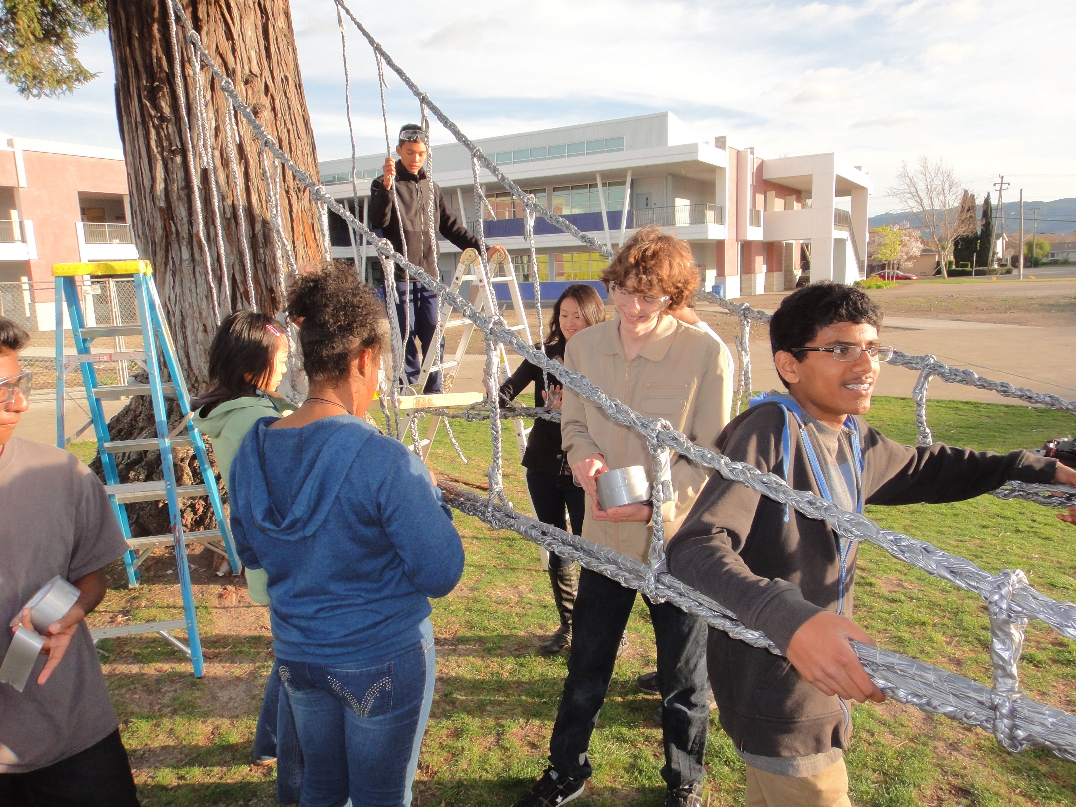 An enthusiastic team of Dublin High School Engineering Academy and Robotics Club students rallied over the long weekend, led by Dublin High teacher Eugene Chou, to build a suspension bridge using only duct tape. The voluntary project, part of Dublin High School’s National Engineers Week 2012 celebration, was made possible thanks to a generous donation of Duck Brand duct tape from the ShurTech Brands company. Dublin High students returning to class Tuesday morning are in for a surprise as they find the distinct silver of Duck Tape transformed into a suspension bridge spanning two towering trees in the center of campus.