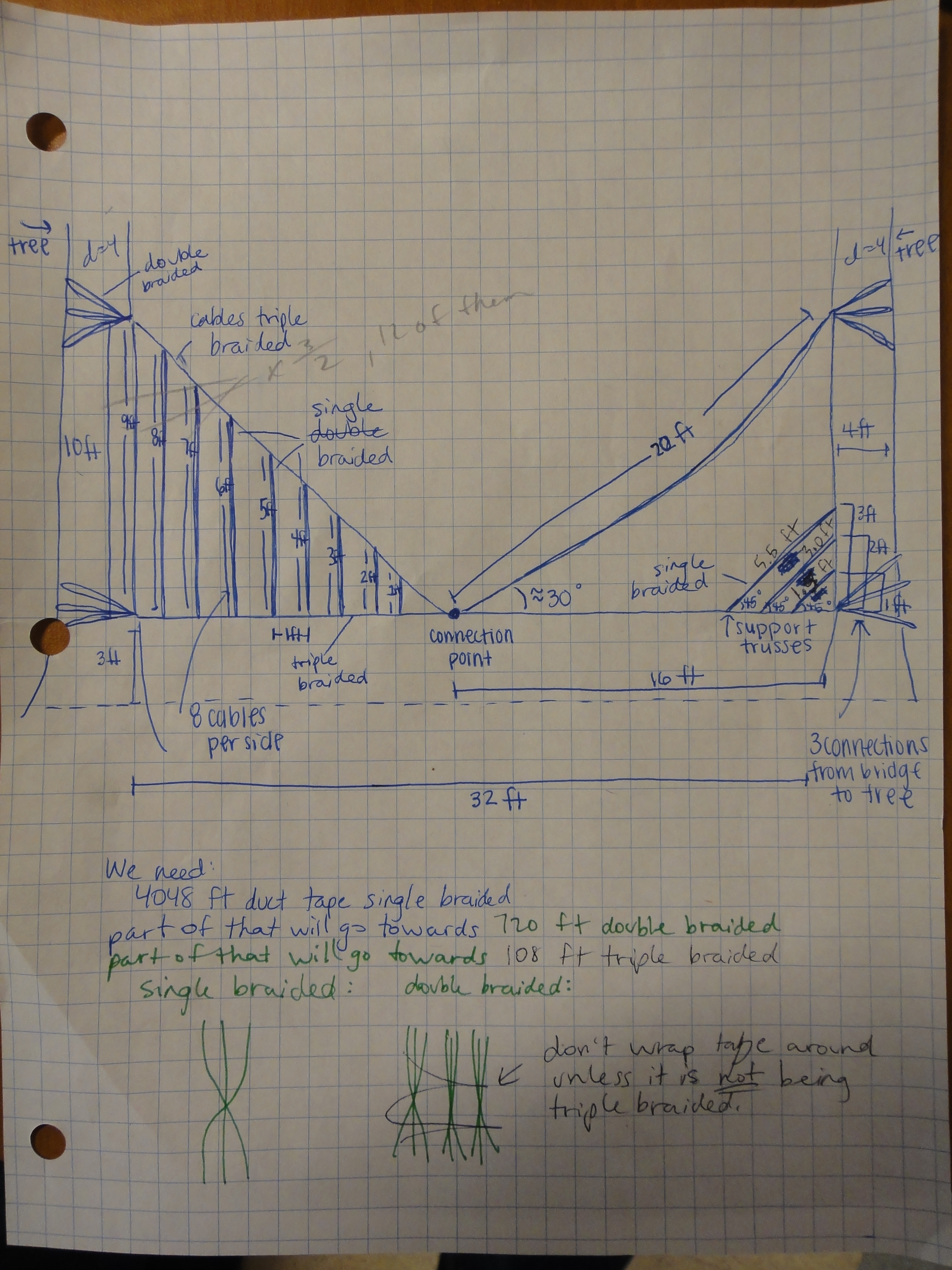 Designing and building the duct tape suspension bridge brought Engineering Academy classroom theory to life as the Dublin High students had to agree on design criteria and constraints (such as making the bridge entirely out of duct tape, building a bridge capable of holding hundreds of pounds, and making the bridge safe – just a few feet off the ground), brainstorm on bridge design options, use a decision matrix to rank possible design attributes, and design a bridge that could be built over a long weekend. The bridge was strengthened by the double-braided design of the cables (a time-consuming option that paid off in the end).