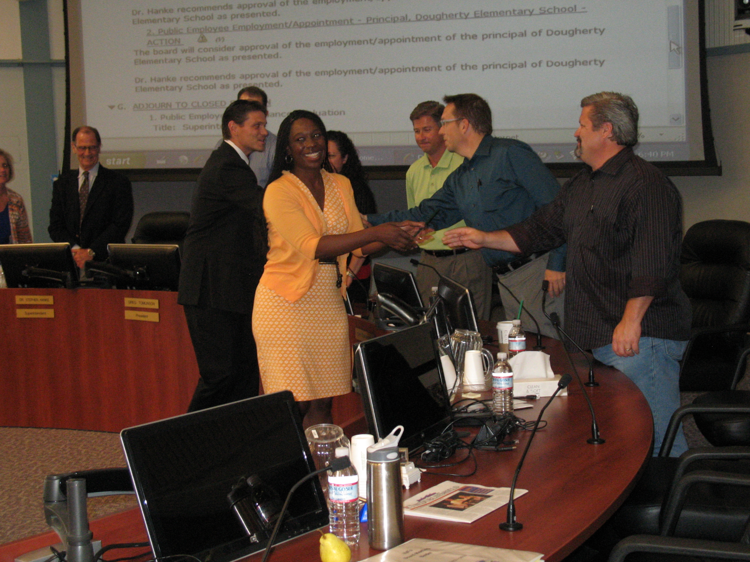 These changes created vital openings at two of our newer elementary schools. At the board meeting, Assistant Superintendent Val Williams explained the search process. The vacancies were posted to the district website and applications were solicited from interested candidates. At the same time a committee consisting of district staff, administration and parents of the affected sites was assembled. After a first pass of interviews, the top-tier candidates were invited back for a second round. Subsequently, a sit down meeting was established with Superintendent Hanke and his executive staff. Thursday evening, two candidates were presented for appointment to the board of trustees. Both candidates were approved by unanimous vote.