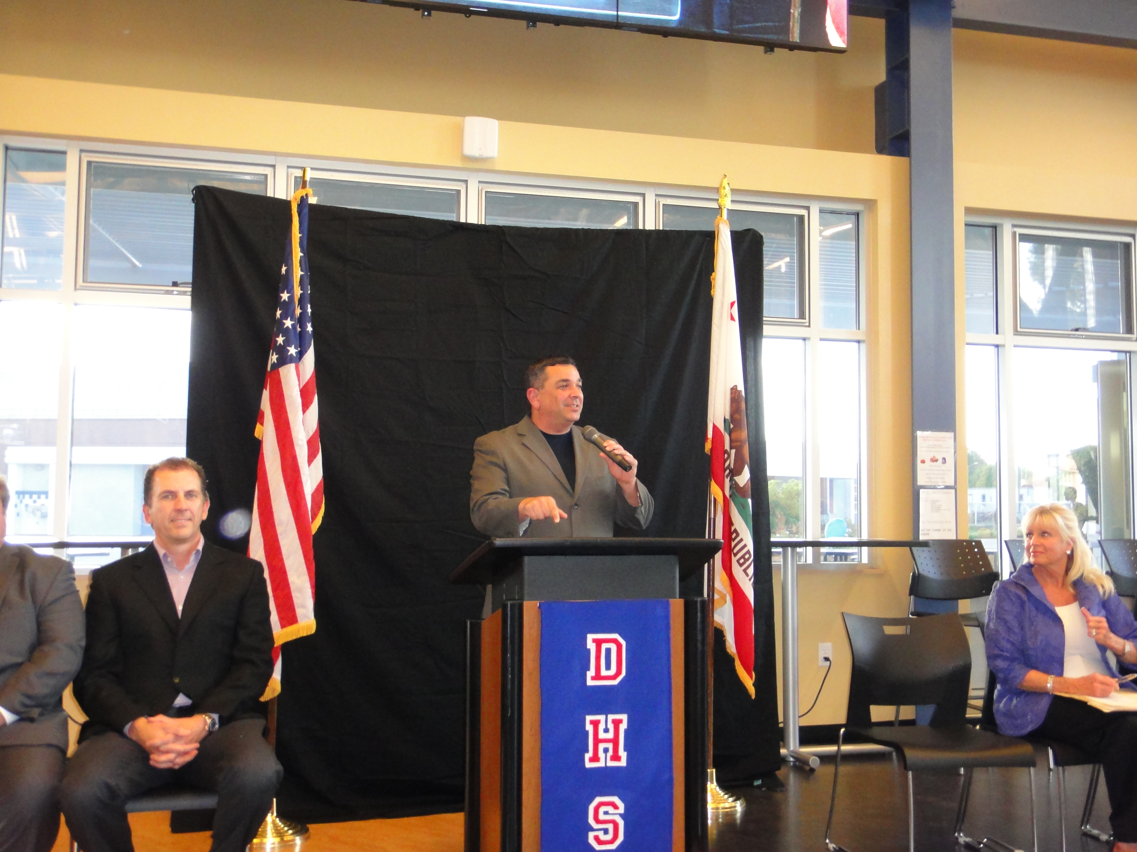 Dublin High teacher and City of Dublin Mayor Tim Sbranti served as the Master of Ceremonies. Following the Pledge of Allegiance, there were brief comments by Student Body Vice President, Luke Legins, Dublin Unified School District Board of Trustees President Greg Tomlinson, Superintendent Dr. Stephen Hanke and Principal Carol Shimizu. The ceremonial ribbon was then cut and the celebration began.