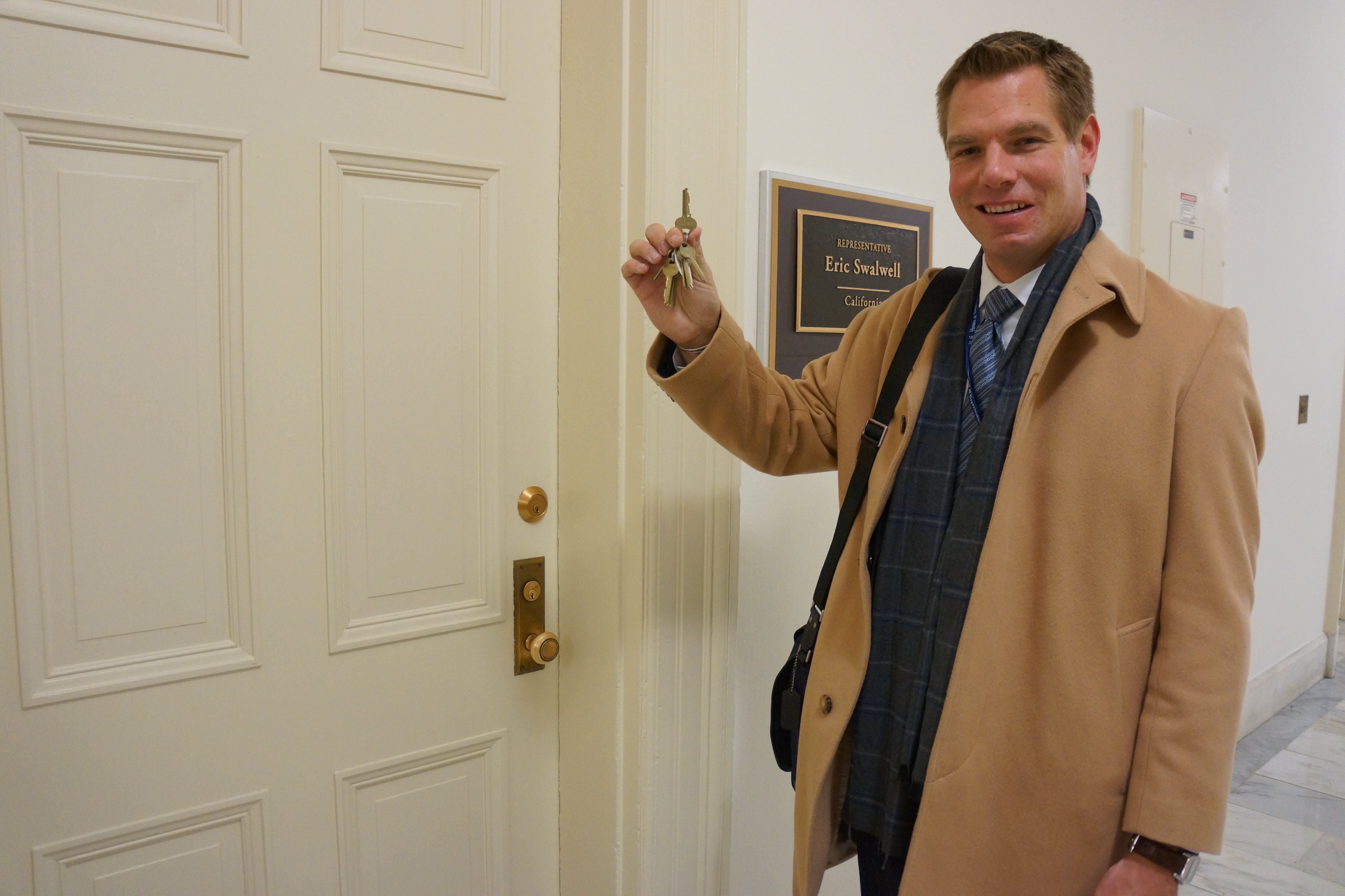 Eric Swalwell on entering his office for the first time, “It was thrilling. It was the fruit of a long campaign season being realized. We started this race back in July 2011 and here we are 18 months later to open these doors, knowing who sent us here and what’s behind these keys: all the people who volunteered; their energy. I felt the momentum of the 15th Congressional District behind me as I walked in – it was pretty exciting. There is a lot of work to do and we want to get started.”
