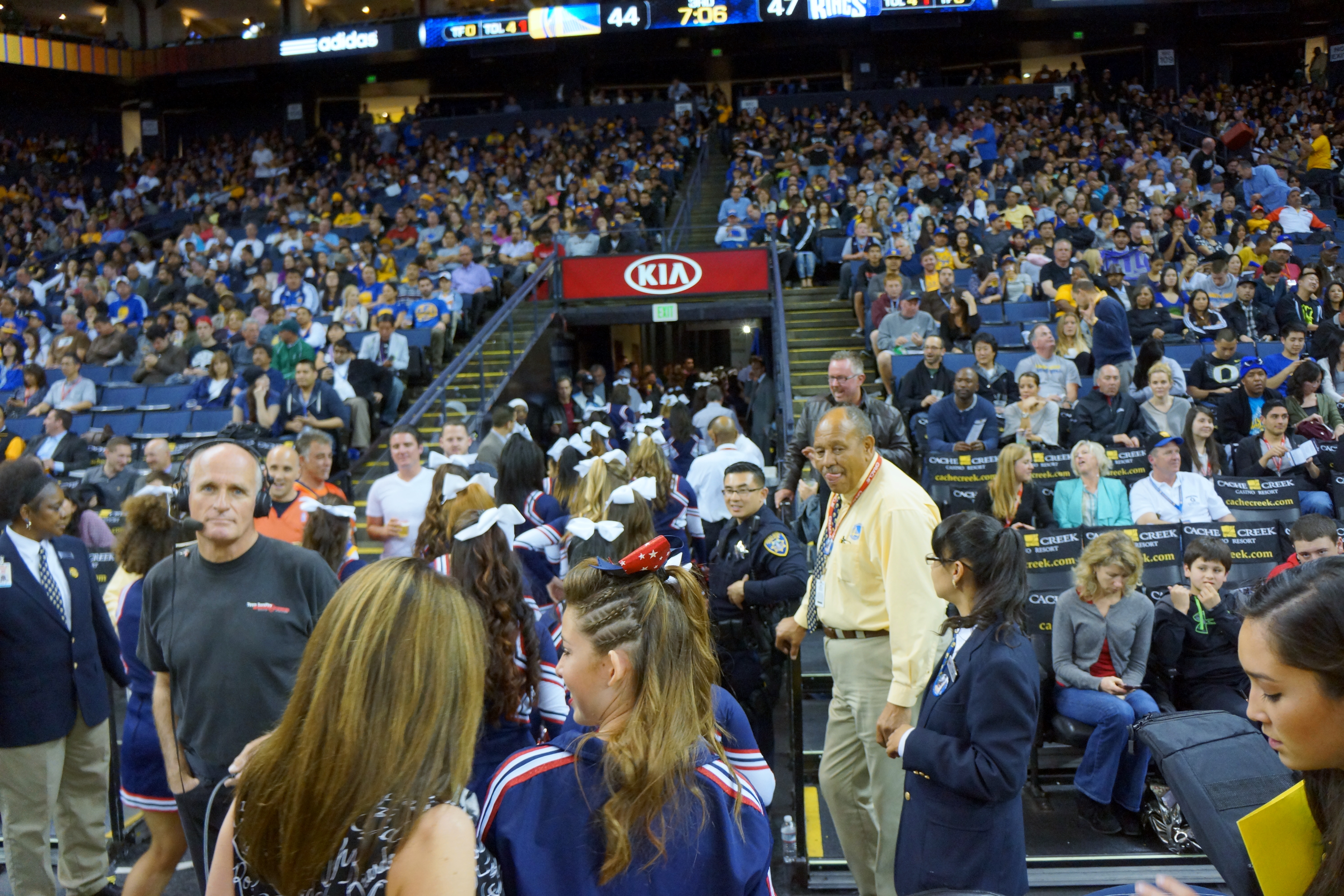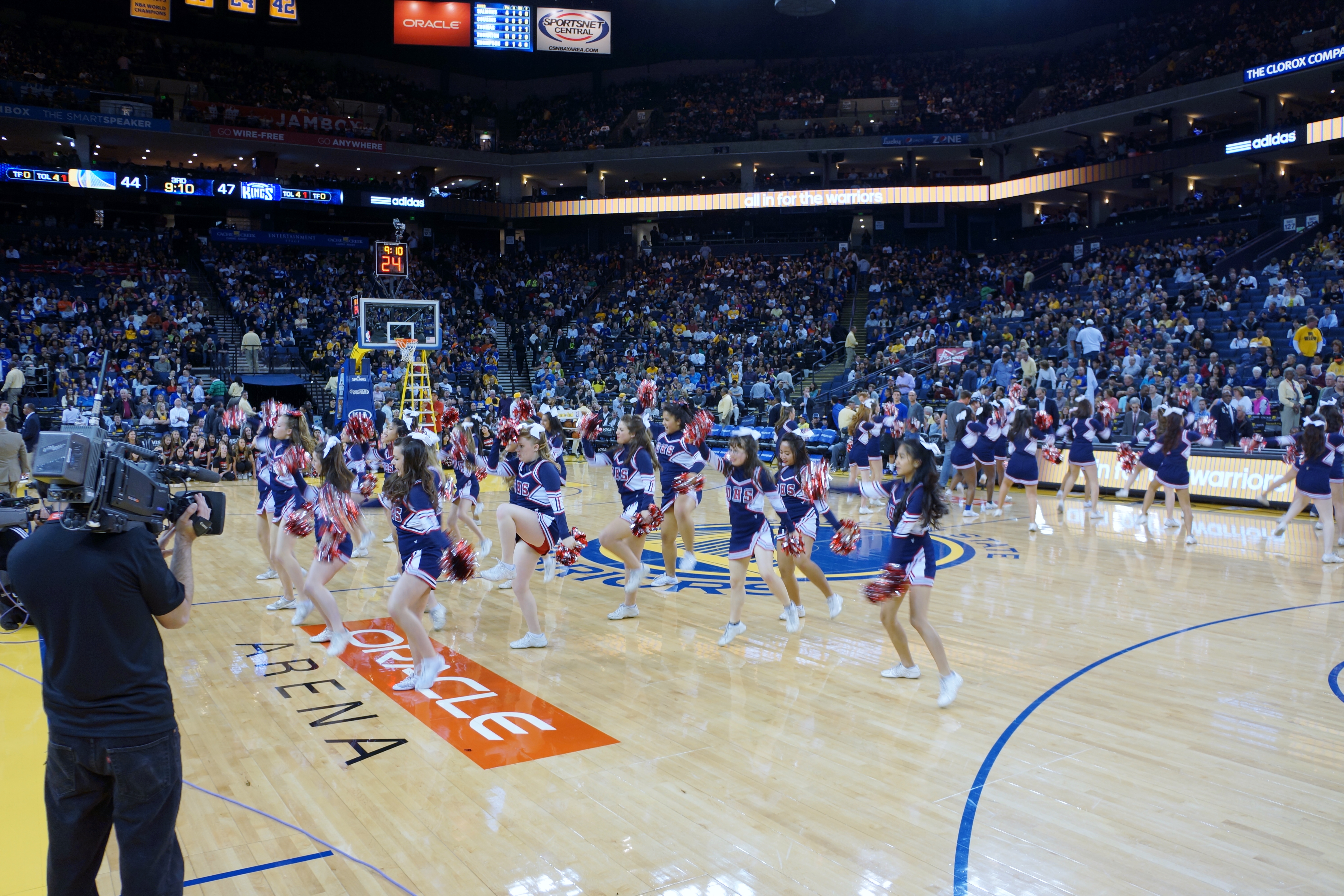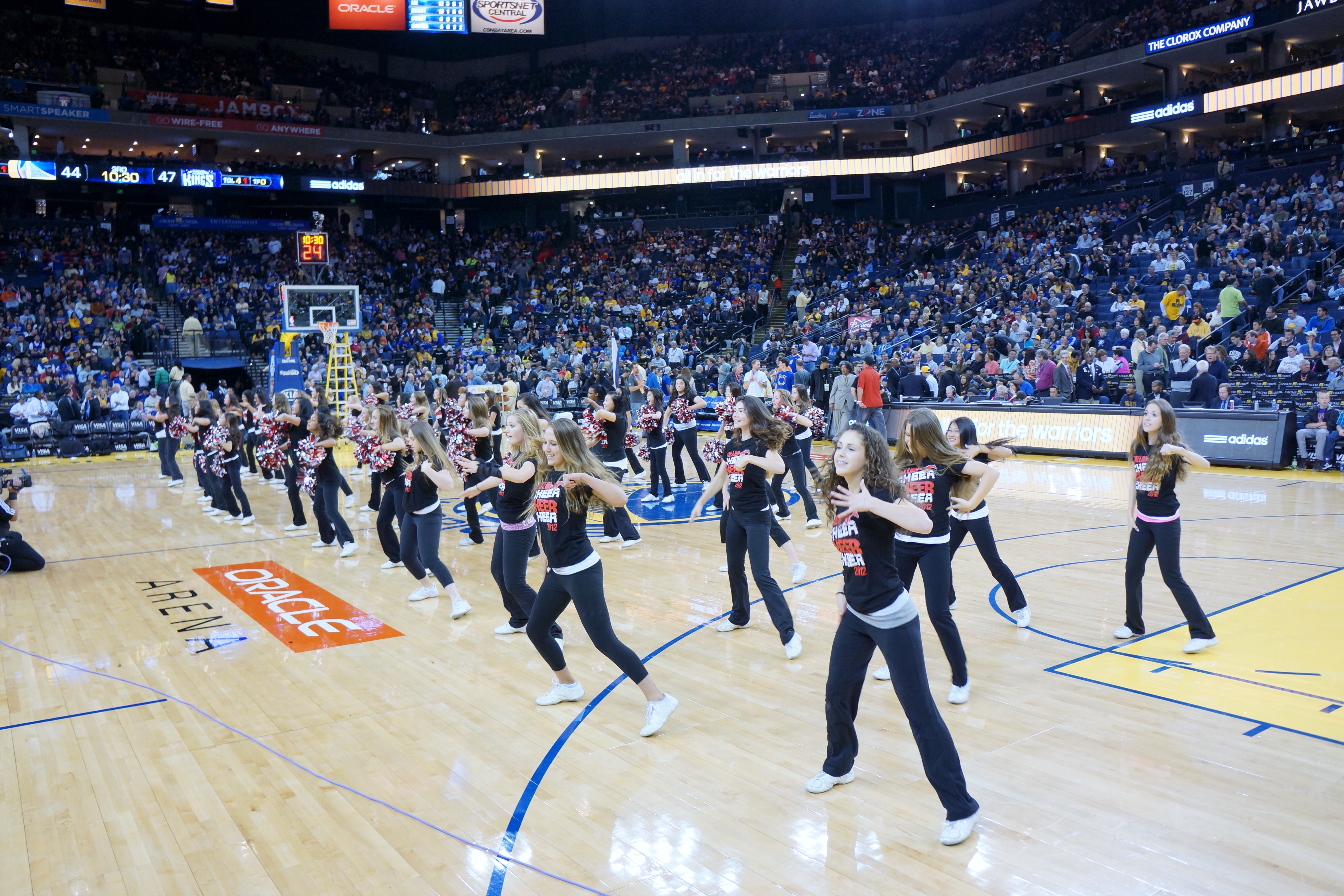 For the third year in a row, Fallon Middle School and Dublin High School took center stage in the Oracle Arena during the Golden State Warriors half time show. They were cheered on by a sold out crowd of Warriors basketball fans and hundreds of Dublin residents who took a Wednesday night road trip to cheer on the teams. The Cheer programs in Dublin schools have expanded dramatically in recent years, due in part to the inclusive policy put in place by Dublin High School Cheer Coach Kristine Cousins (who started her Dublin Cheer career at Fallon Middle School). The Cheer program is split into multiple Spirit Teams and the selective Competitive Cheer Teams. All Cheer participants have to maintain academic standing and follow a code of conduct to participate and compete.