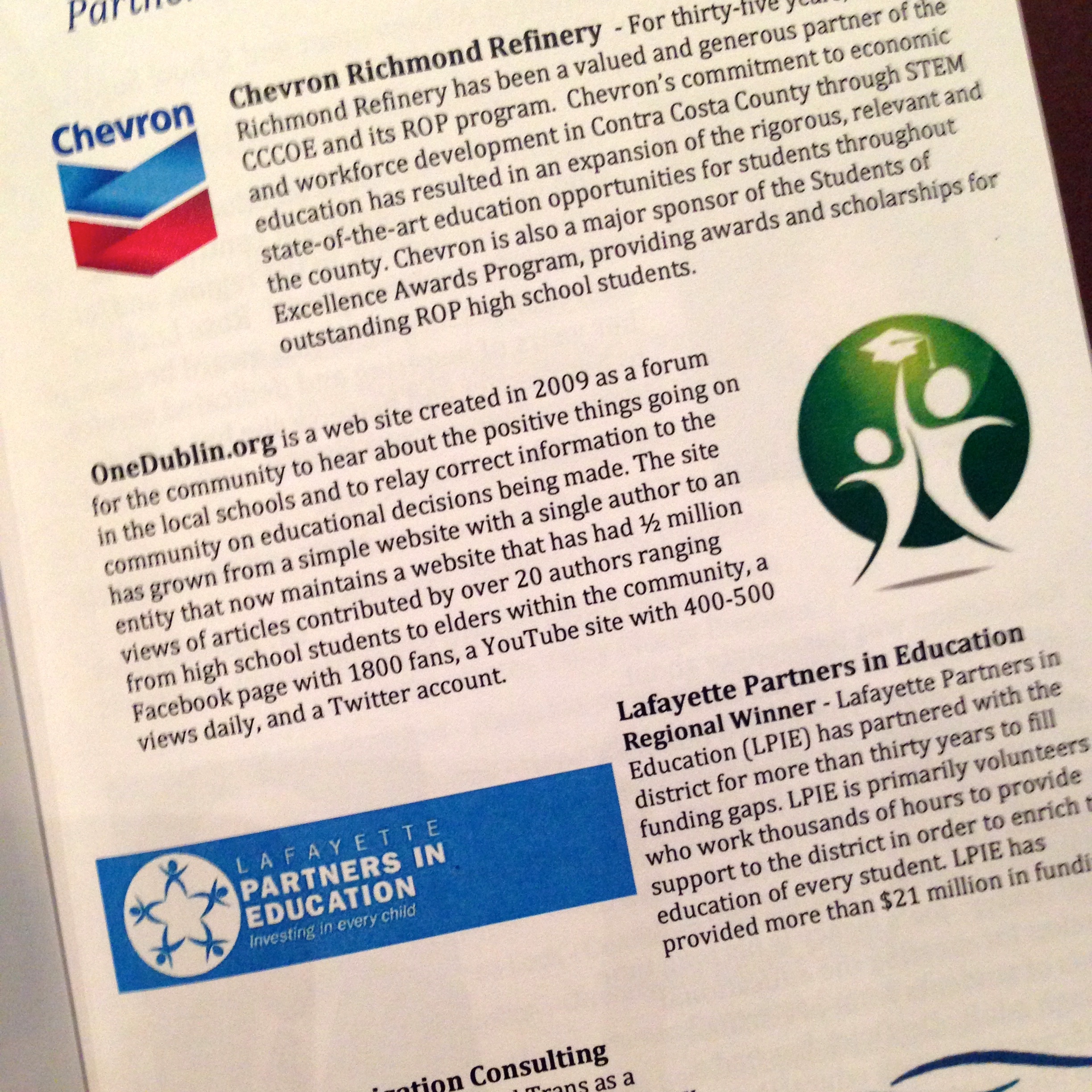 We are pleased to share that OneDublin.org has been awarded with the Partners in Educational Excellence Award from the Association of California School Administrators (ACSA) Region 6, and is now moving forward to the California State round of competition.