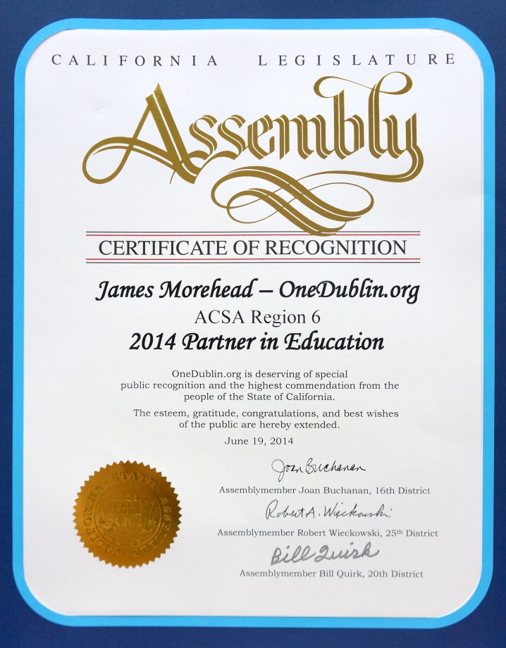 » OneDublin_org California Legislature Assembly Certificate of Recognition ACSA Region 6 2014 Partner in Education