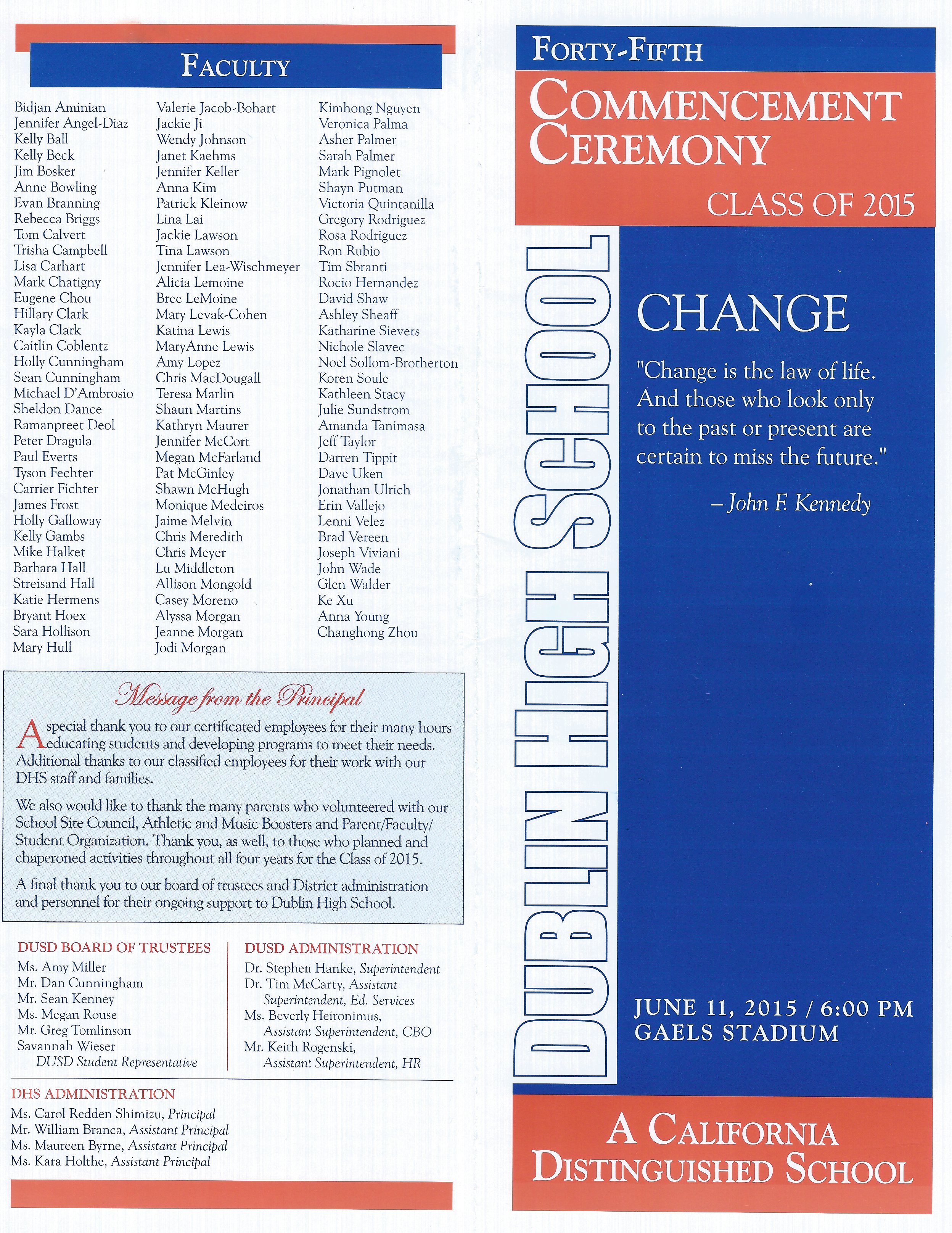 This year’s theme was “Change” – and the Class of 2015 has a lot to celebrate. Over 97% of Dublin High’s Class of 2015 will be attending college this Fall, including Harvard, Stanford, Cornell, every University of California (UC), every CSU campus and and many more.