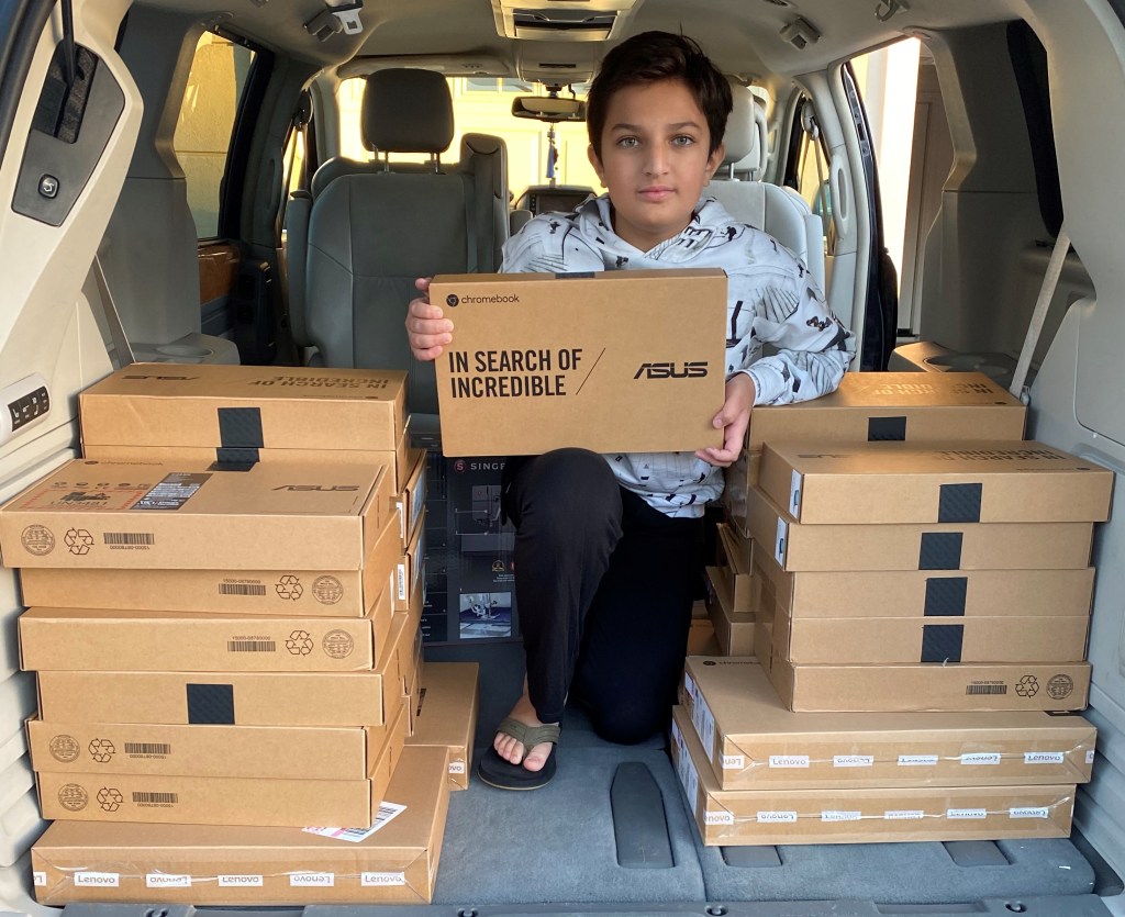 On Saturday mornings I have helped at the food pantry at the Muslim Community Center in Pleasanton. During COVID, I have seen how the number of families that are in need have grown. We used to just make 60 packets of food for families but then with COVID those numbers started to go up and then when the Afghani refugees started coming to our area the pantry was helping about 300 families. Last November, I volunteered to help at the first free bazaar that was being set up for refugees to allow them to get personal belongings like clothing, shoes, blankets, dishes, etc. I was assigned to the checkout area that day. At that station, someone would give them new underclothes, socks and blankets and also gift cards for any items they needed but couldn’t find at the bazaar. We serviced 40 families at that bazaar, but I remember we only had 10 Chromebooks. Each family that didn’t get a Chromebook was so disappointed. When I went home that evening, I told my mom that I really wished there were more Chromebooks to give out. A Chromebook for them meant they could use it to do homework, watch a show, look for a job, and even connect with far away family and friends. I asked her if she would help me set up another GoFundMe page. Just like before the first thing that came to mind was to ask my mom for help and both of us masterminded the majority of the planning. First, we made, designed, and I wrote out my story and again emailed it to friends and family. I wanted to raise enough for 50 Chromebooks for our next monthly bazaar in December. My mom thought that I was setting too high of a goal and wanted me to stick to a reasonable goal like 10 Chromebooks. I kept insisting that I wanted to aim for 50. I convinced my mom to set our goal to $5,000. We quickly were able to raise over $5,000 but then something I could never have imagined, happened. I got a very generous match. A family with four sons reached out and matched every dollar I raised. I was so excited, I couldn’t even sleep. All along I just knew I would be able to meet the goal, but it was a lot of work on my part even after I had raised the funds. I spent most of my holidays looking through Black Friday sales and sale ads to get the best deals on Chromebooks. We spent a lot of time purchasing many Chromebooks. Many of the good deals would limit only two per purchase. However, everyone in the community was so supportive and proud of me. The organizers at MCC had me personally hand out the Chromebooks to each family at our December bazaar. Each family received a Chromebook then and it was all worth it at the end.”