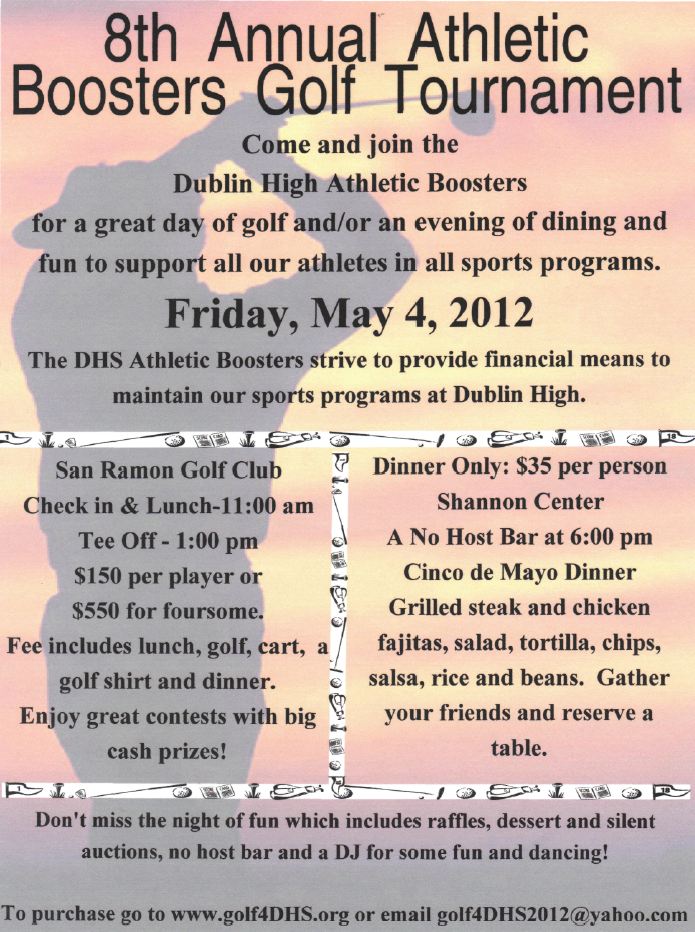 Planning is underway for the 8th Annual Dublin High School Athletic Boosters Golf Tournament and Dinner/Auction to be held on Friday, May 4, 2012. The Athletic Boosters provide financial support for all 22 teams at Dublin High School, serving over 650 student-athletes, and also pay for the athletic trainers who assist the coaches and help provide rehabilitation services to all of the athletes (flyer attached below).