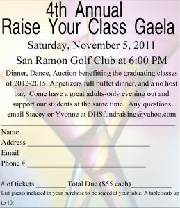 The 4th Annual “Raise Your Class” Gaela will be held on Sat. November 5th at the San Ramon Golf Club at 6:00 p.m. Come join us for an adult evening that will include appetizers, buffet dinner, no-host bar, as well as dancing. There will also be silent, live, and dessert auctions plus lots of great raffle items!