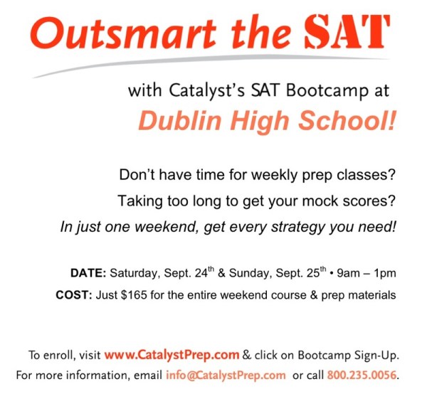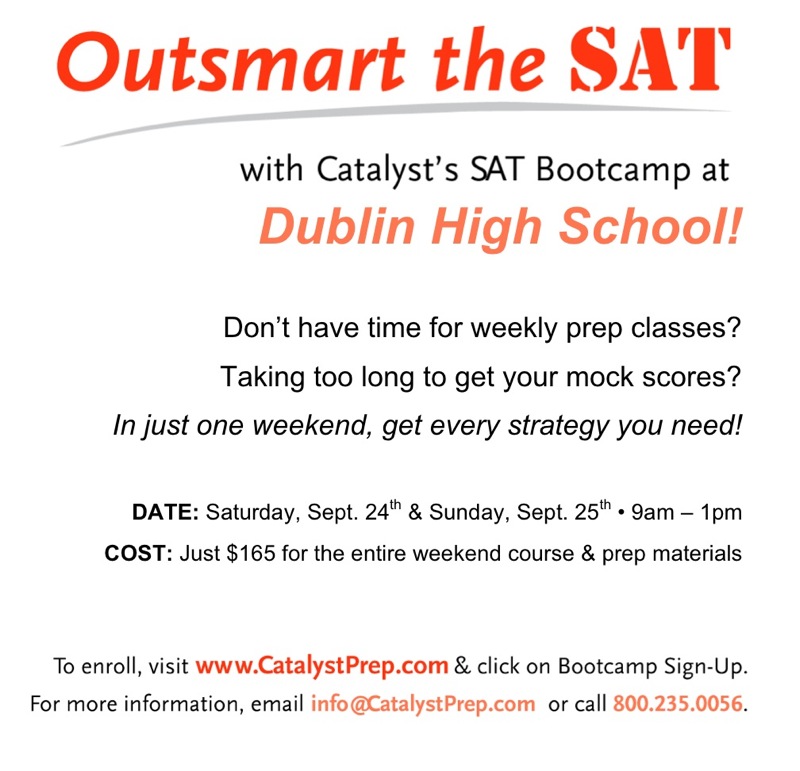 Dublin High will be holding a practice SAT test for students on Saturday, September 17th from 9am-1pm. The cost is $15. For more information, please see Mrs. Halket in the Counseling Office or email halketkim@dublin.k12.ca.us.