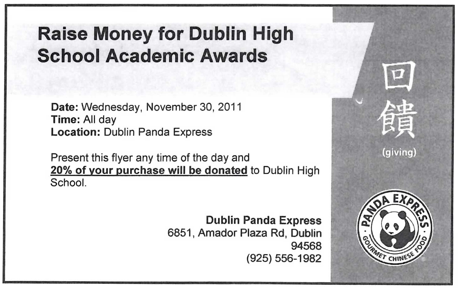- The next Academic Awards Fundraiser will be held on Wednesday, November 30th at Panda Express on Amador Plaza Road in Dublin from 11 am-9 pm, and Yogurtland located next door. Panda and Yogurtland will donate 20% of pre-tax sales. Please bring the flyers attached below. No coupons, discount gift cards or other promotions can be used with this fundraiser.