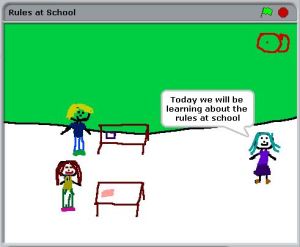 But since seeing is believing check out the Scratch creation my 9 year-old daughter created (available here). She drew all of the sprites herself and programmed them to interact. Pretty cool. (Note: viewing Scratch creations online requires Java to be installed – if you get a message about Java not being installed it only takes a minute to do so at: www.java.com). A scene from her creation is shown at the right. The full computer program includes multiple characters (sprites) moving and interacting based on the computer program developed by my daughter. Pretty cool.