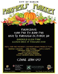 Dublin Farmers’ Market: This Thursday, May 12, the City of Dublin launches its new Farmers’ Market! The Market will be held every Thursday, from 4:00 p.m. to 8:00 p.m. at Emerald Glen Park (on the Gleason Dr. side) until October 20. While you can expect to find the freshest California produce available, you’ll also discover that the Dublin Farmers’ Market promises fun for the whole family. There will be “theme weeks” each month to entertain and educate. Please visit the website at http://www.ci.dublin.ca.us/index.aspx?NID=928.